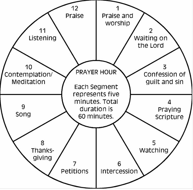 In his book, The hour that Changes the World, Dick Eastman suggests that one divide an hour into 12 periods of 5 minutes each. After 5 minutes you change to another form of prayer. The following is Dick Eastman’s grouping.
